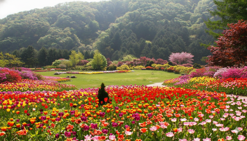 축령산의 빼어난 자연경관을 배경으로 한국의 미를 살린 정원들이 모여 있습니다. 4월에는 봄꽃축제가 열려 튤립, 철쭉, 수선화 등 수많은 꽃을 감상할 수 있습니다.